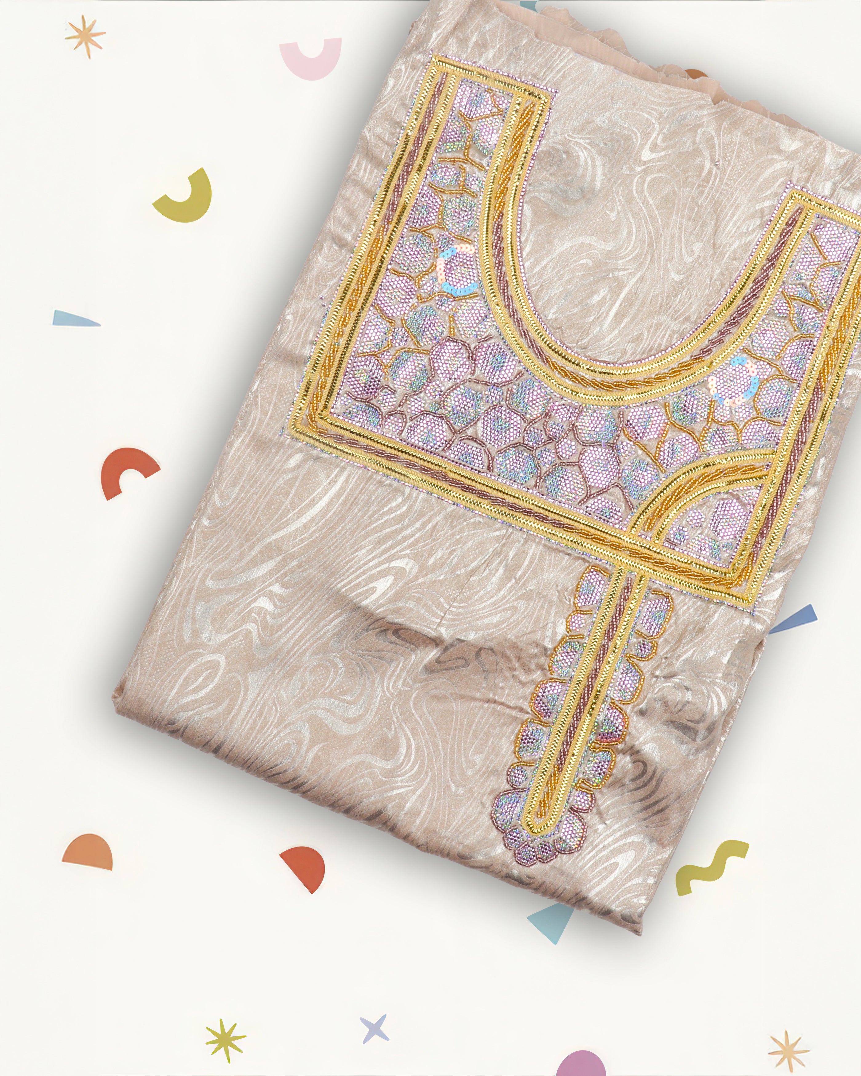 Elevate your little one’s look with this elegant jacquard silk design featuring a unique square-shaped crystal work pattern. Available in four stunning shades: cream, royal blue, brown, and pomegranate – each paired with a matching headband for a graceful finish.