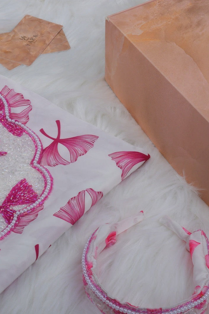 A charming mini set for the little one, made from soft white silk with pink hibiscus prints, finished with delicate crystal work. Comes with a matching headband for a sweet, coordinated look.
